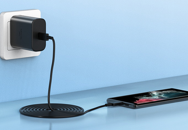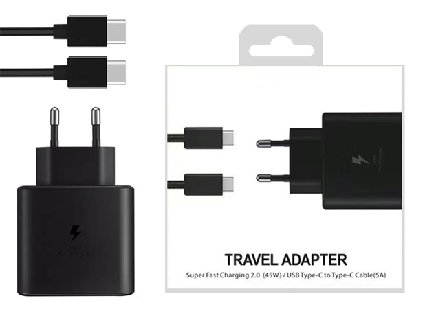 - USB C to USB C Cable- The 45 watt usb c charger block kit come with a detachable USB-C to USB-C cable, so you can charge your phone from any other USB-C power source such as your phones, tablets, and computers. Use the cable to sync and transfer files at blazing speeds with your Galaxy or any other compatible smartphone or laptop.